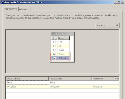 - In “Aggregate transformation editor”, bottom side we can find the “Input column, output alias, Operation etc”. In the operation section, we should mention sum operation for “Price” and group by operation for “Sell_date”. In "Output Alias" section change field name price to "Total_price".